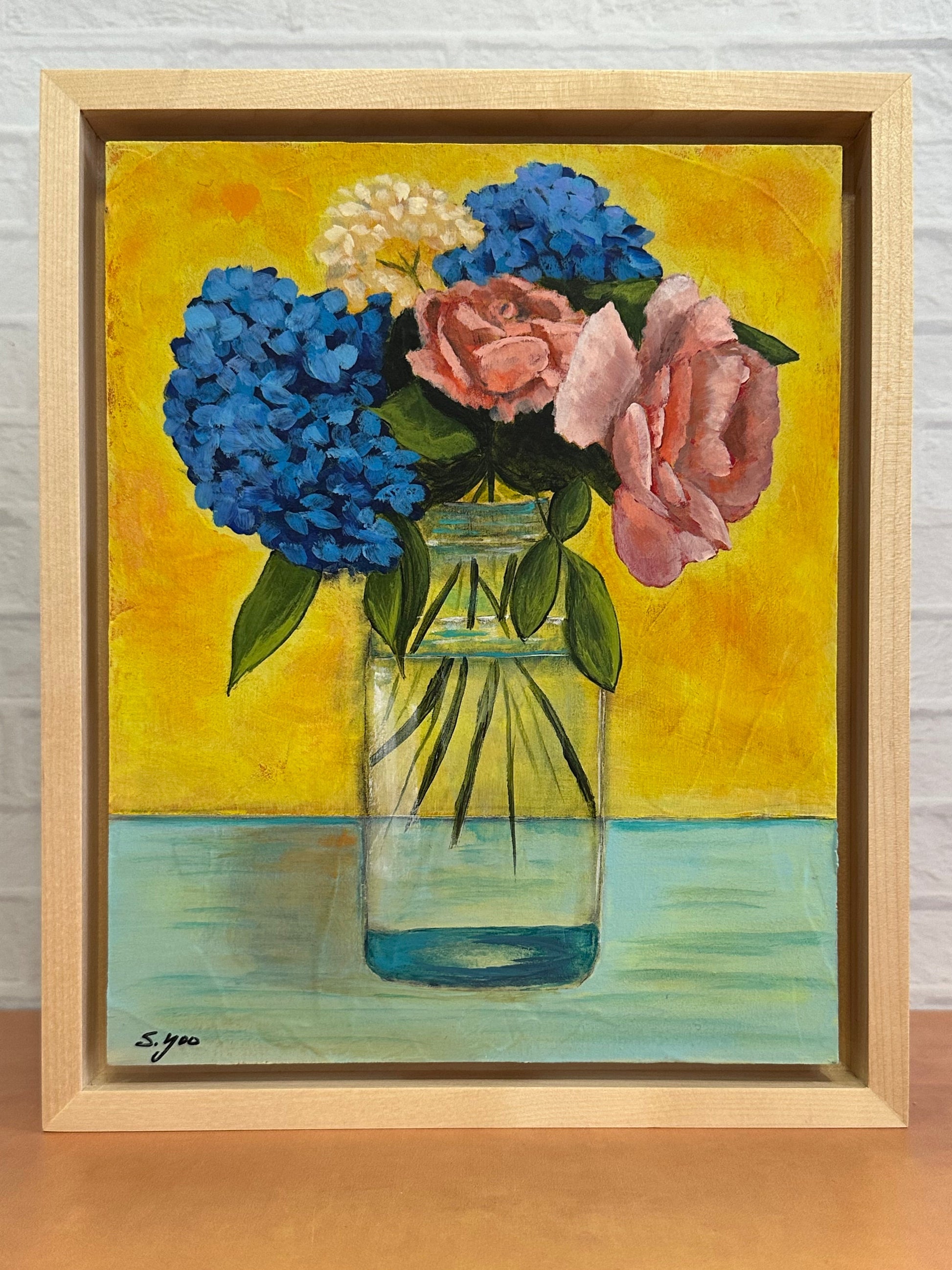 Original 8" x 10" Acrylic Painting on hardboard wood panel (framed in 1 1/12" depth natural wood frame). Signed on front. Sealed with isolation coat and satin varnish.